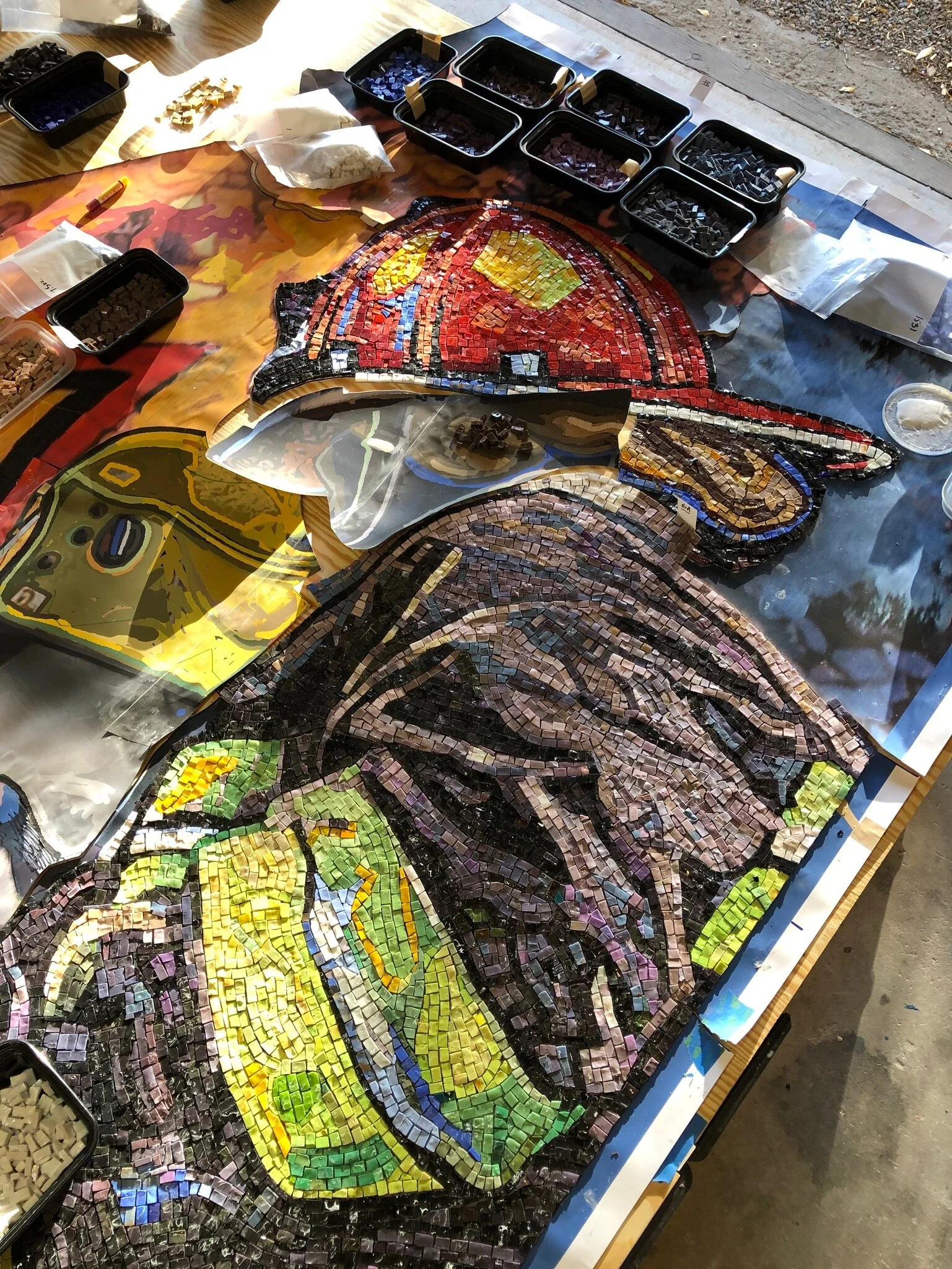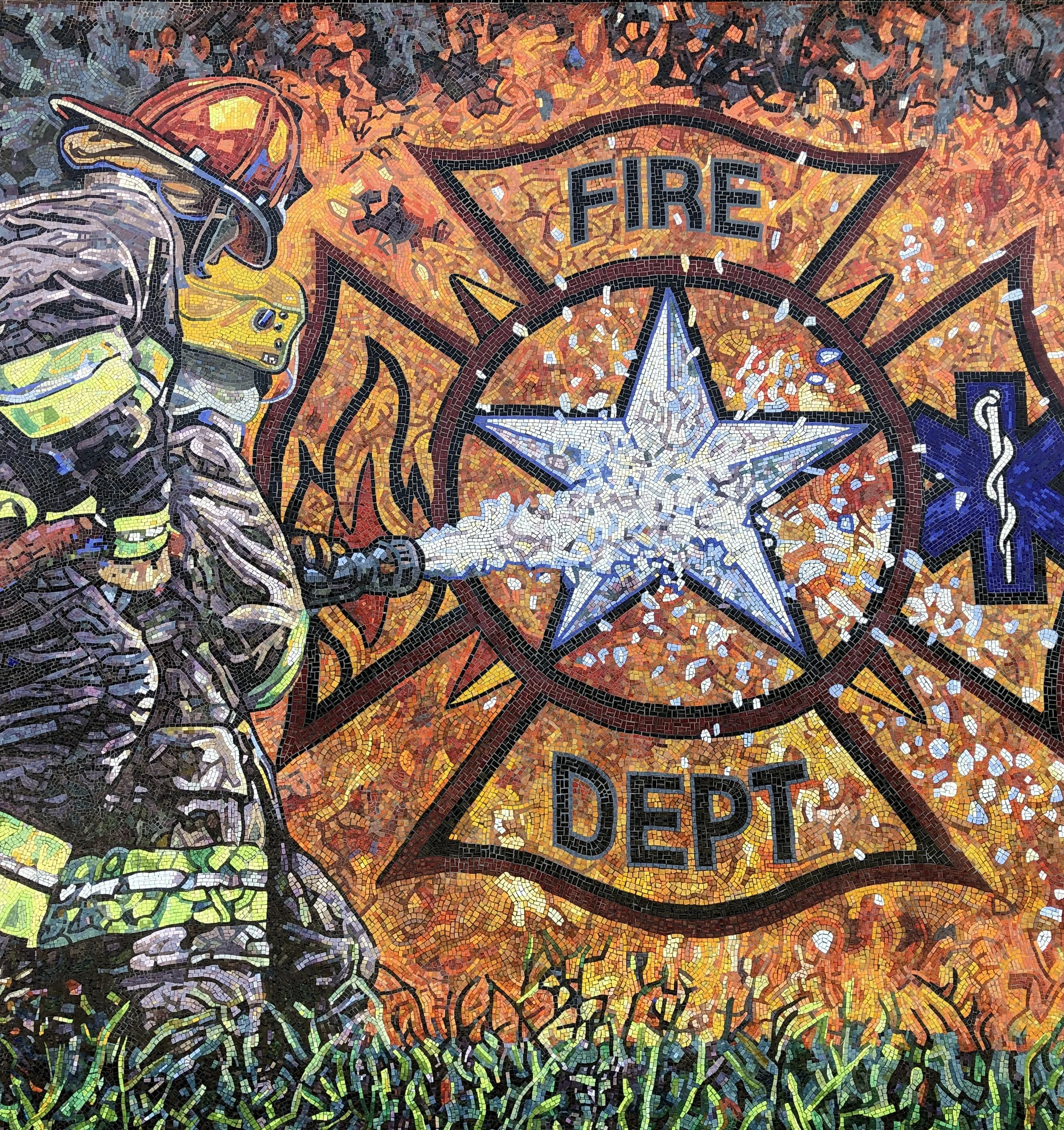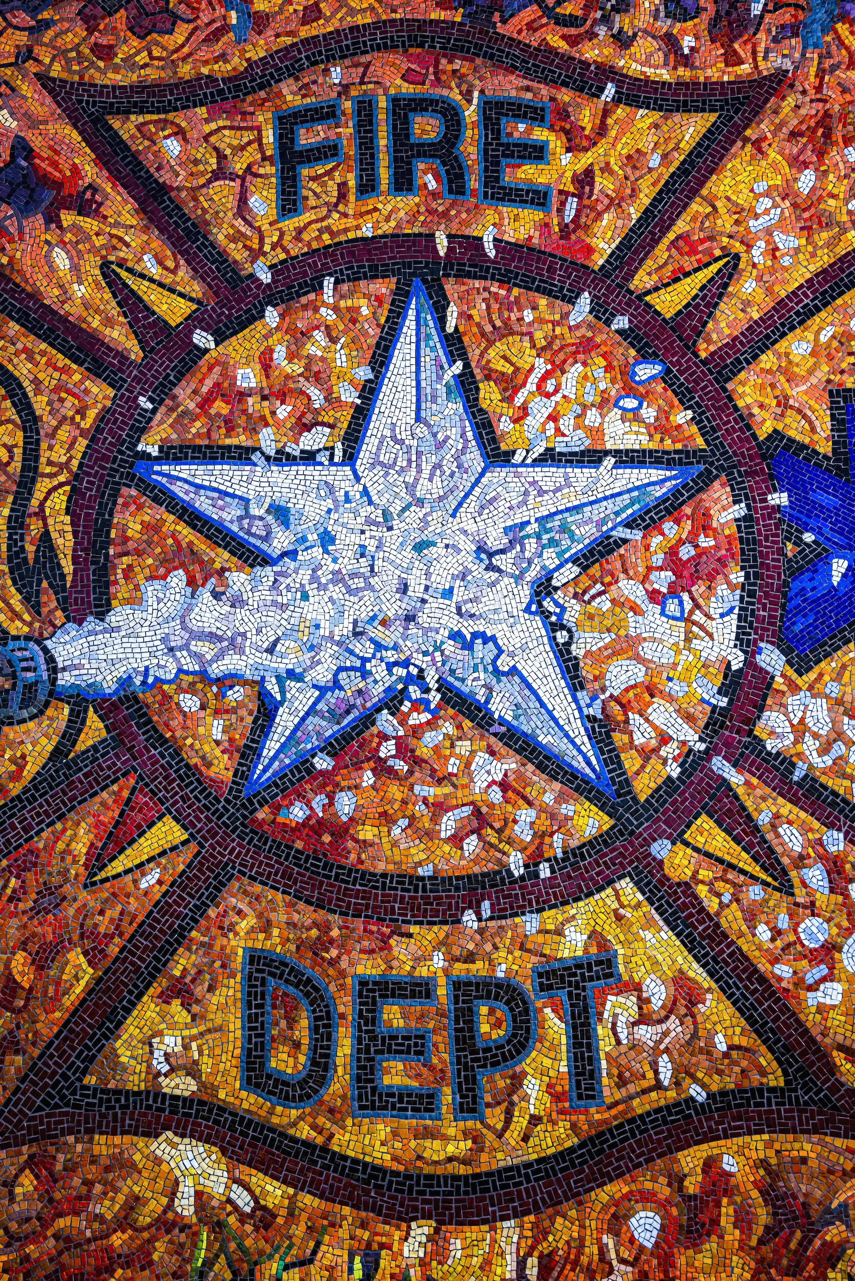 A custom 12 x 12-foot mosaic designed by John Wehrle of Trout in Hand studio, Richmond, CA. "First In" refers to the emergency responders who take on the most dangerous tasks, as they are most always the first to arrive on scene.