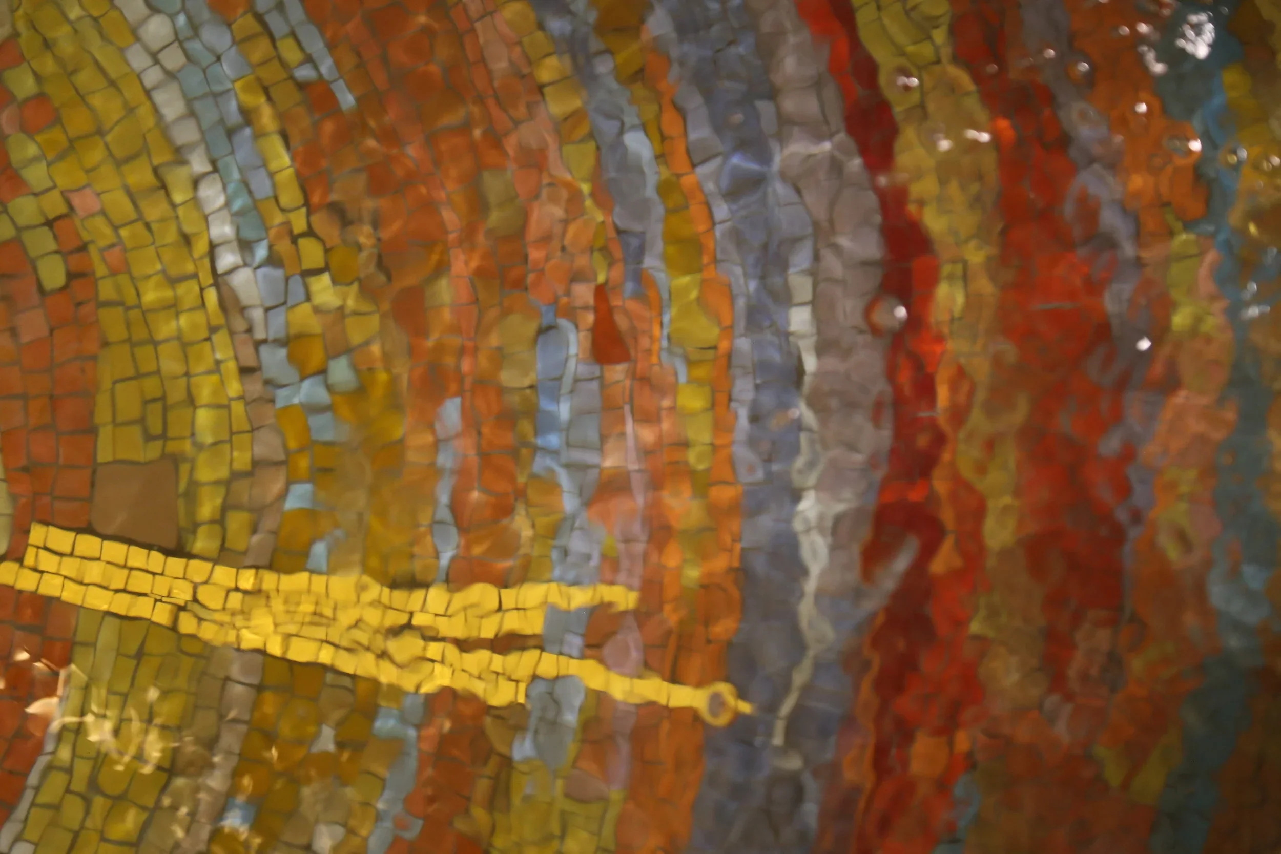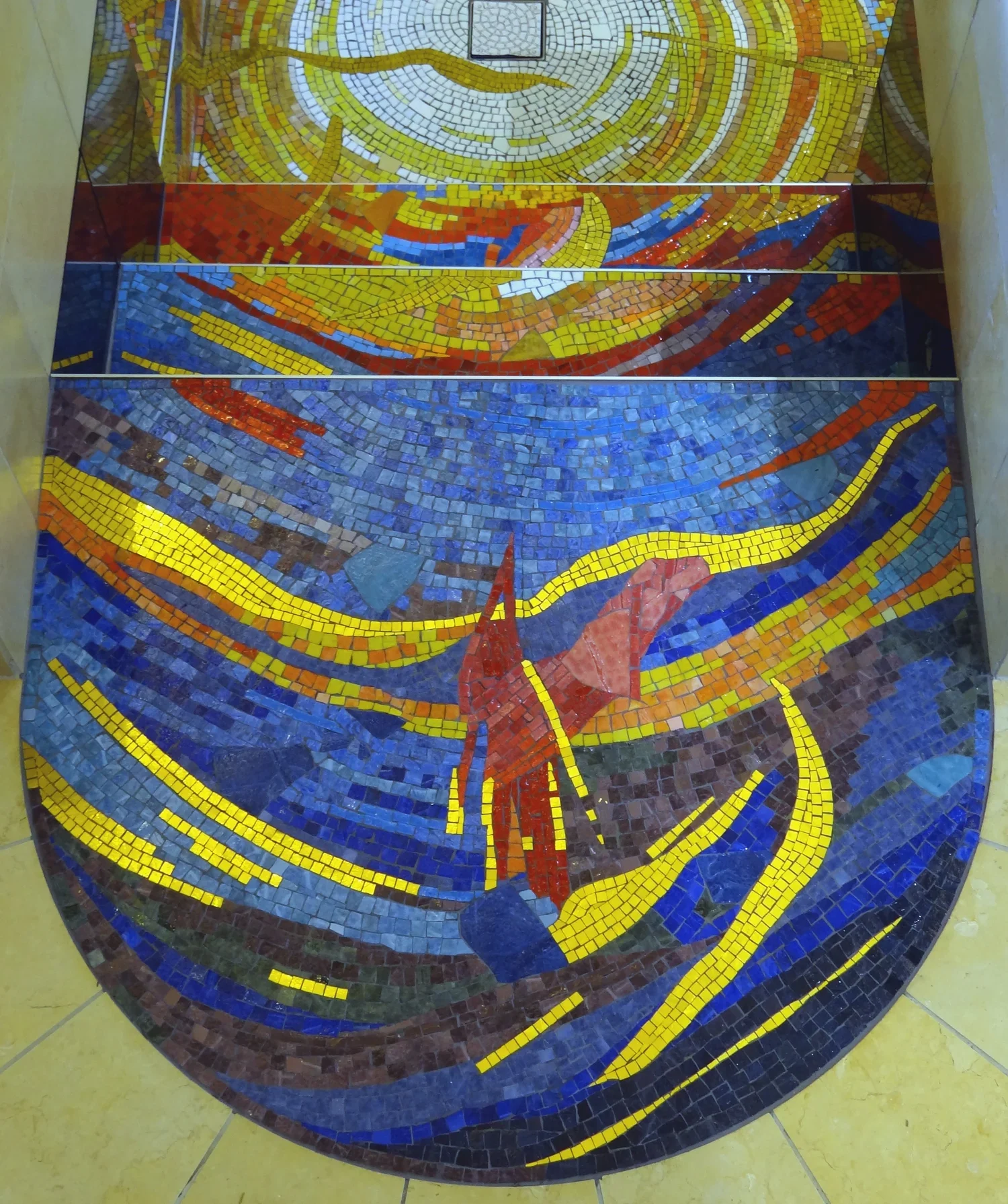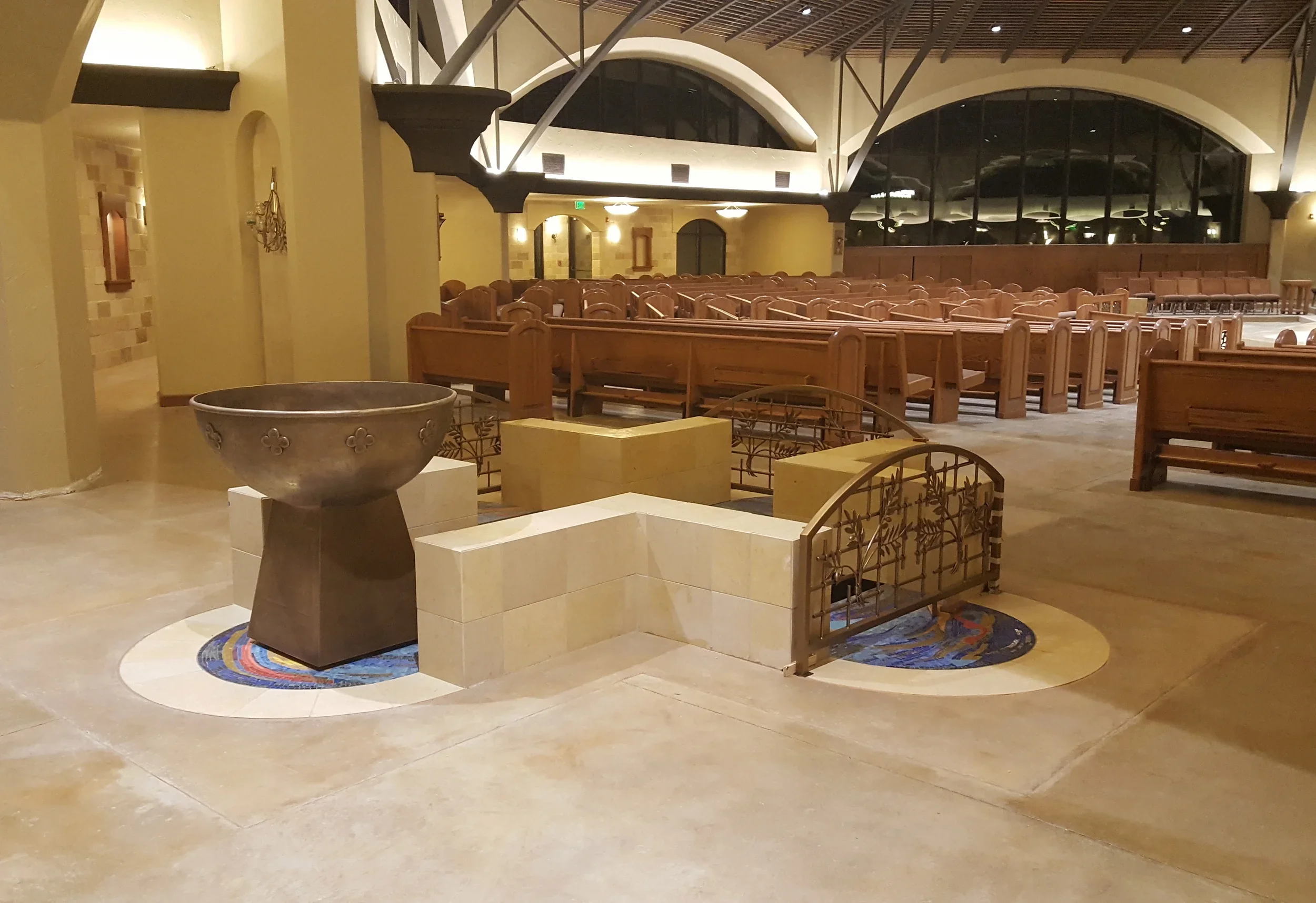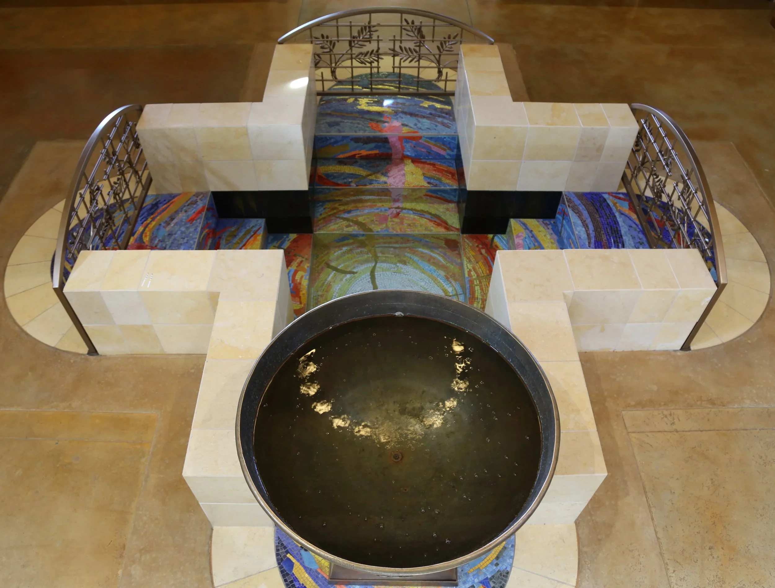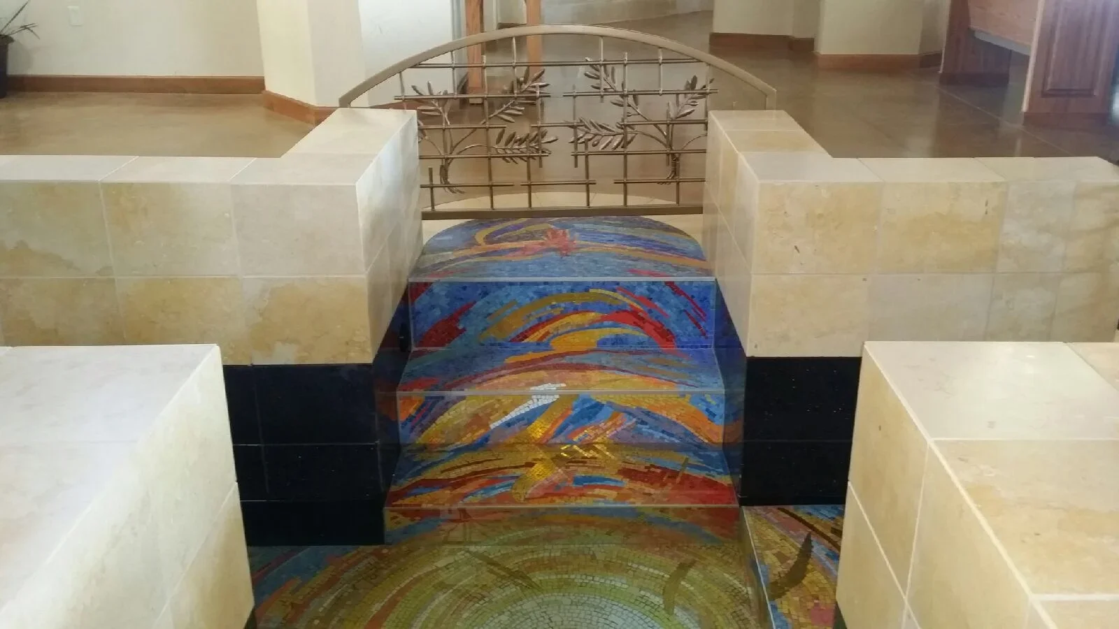 Baptismal font (2015) for St. Frances Xavier Cabrini Catholic Parish, El Paso, TX. Mexican and Italian glass smalti.
