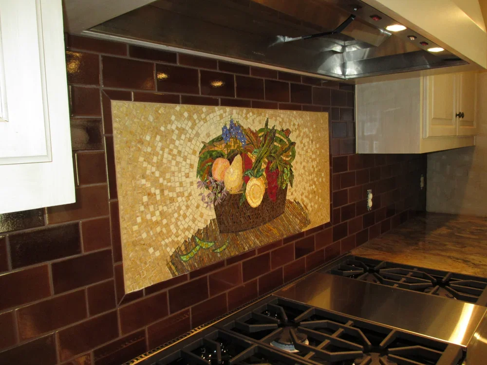 Backsplash field tile is "Espresso" crackle finish subway tile from Heath Ceramics in Sausalito, CA. This client has an impressive collection of bluebonnet paintings, so she asked us to incorporate the bluebonnets in a more culinary motif for the stove.