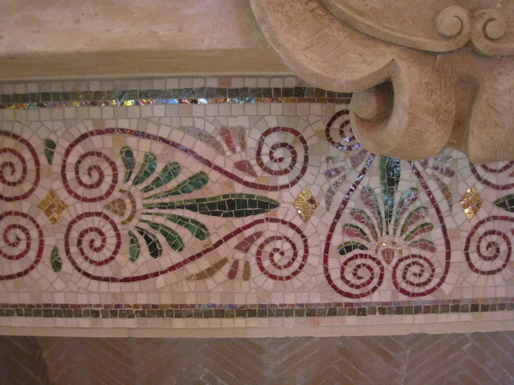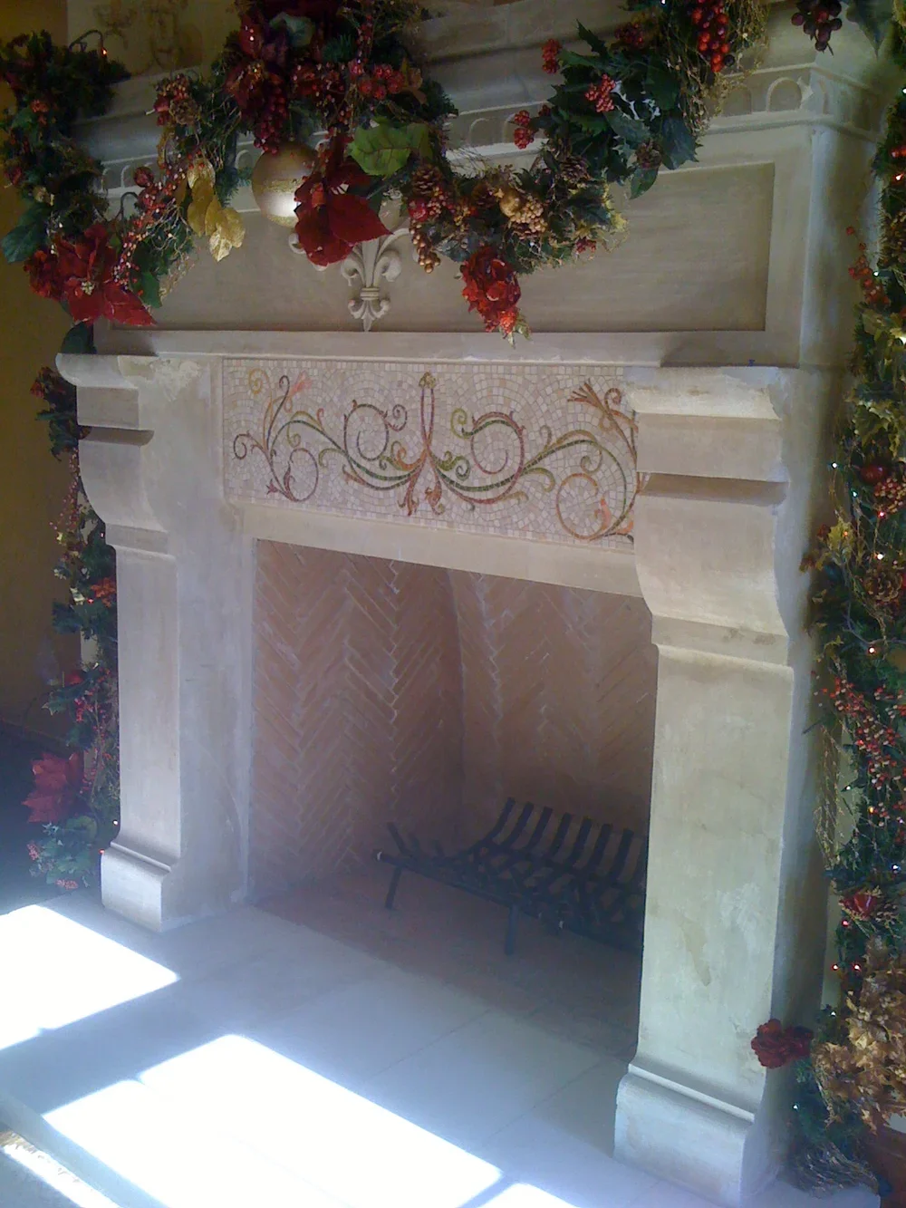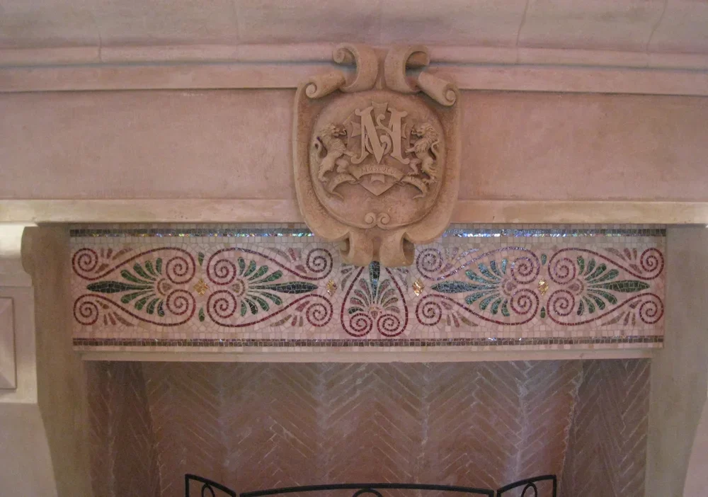 This limestone carved fireplace was shipped from Italy, but the lintel piece cracked in transit. To cover the obvious signs of the patch, we suggested a classical smalti and stone mosaic.