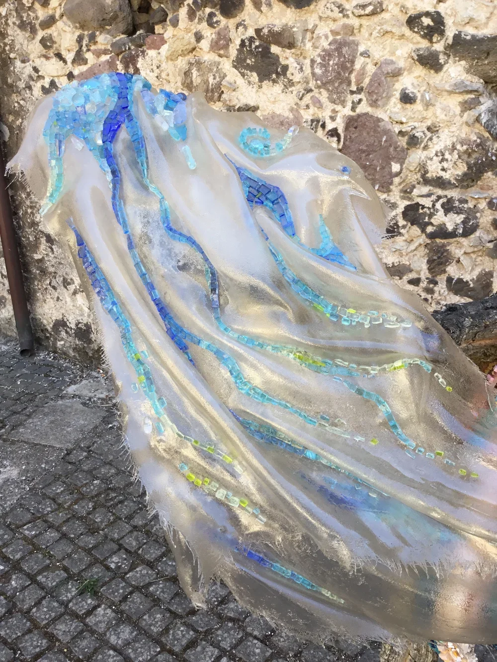 Created during the 16-day Sardinia Contemporary Mosaics Symposium in August, 2017, "Il Maestrale" is a reflection on the elemental and cultural influences of Sardinia. The Symposium theme was "Sardus Pater," the father/diety of Sardinia, whose mythic actions formed the cultural base of the island's inhabitants for millennia. From the Bronze Age Nuraghi to the Carthaginians to the Romans, the idea of Sardus Pater had great influence. The mosaic is in two distinct parts: the left side reflects the influence of wind and water on Sardinia: bringing foreign influences by sea and air; dictating the climate and sea life that sustains its people. The right side represents the land; crops, cuisine, settlements, and the destructive nature of wildfires. While we were in Ploaghe, wildfires raged in central Sardinia, fanned by the hot Sirocco winds. A record-breaking heat wave baked the island. Suddenly, the Maestrale wind arrived, bringing unseasonably cold weather.
