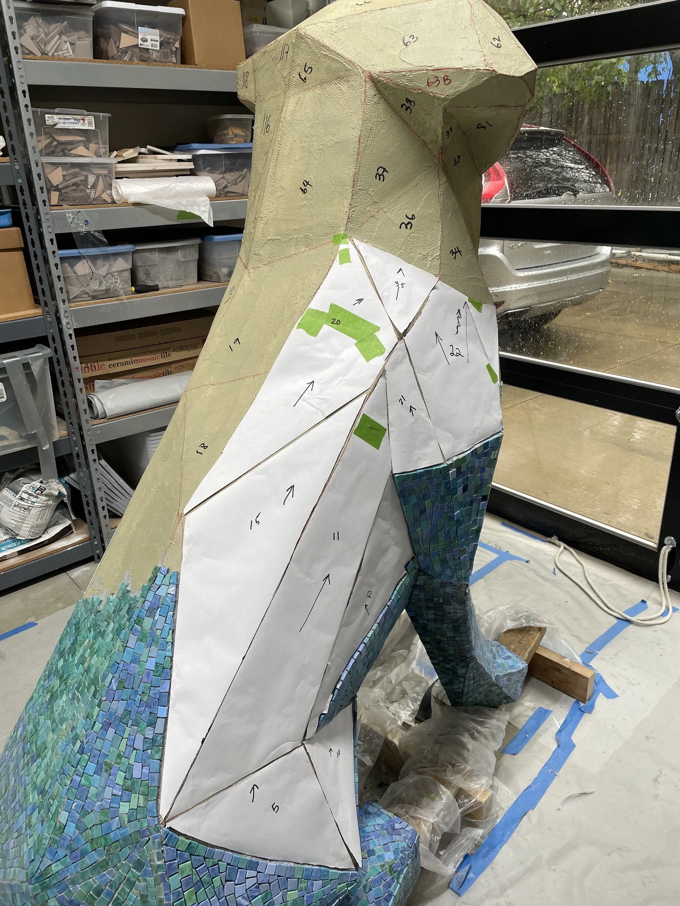 Once she arrived in my studio, we smoothed out the rough areas with more thinset. Then we numbered the facets and created color mixes for the shadows and highlights. We used electrical tape and construction paper to experiment with placement of eyes, nose and mouth.