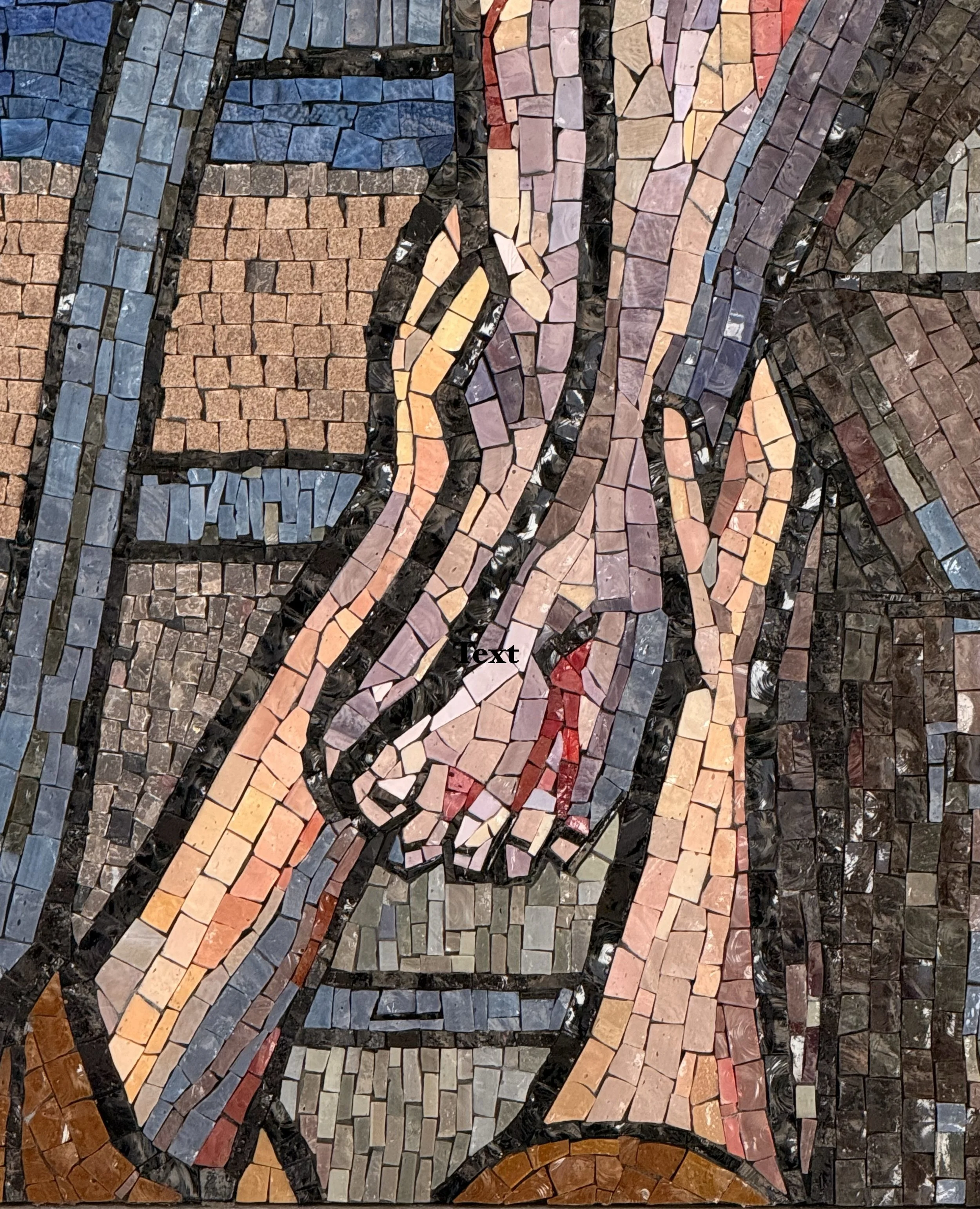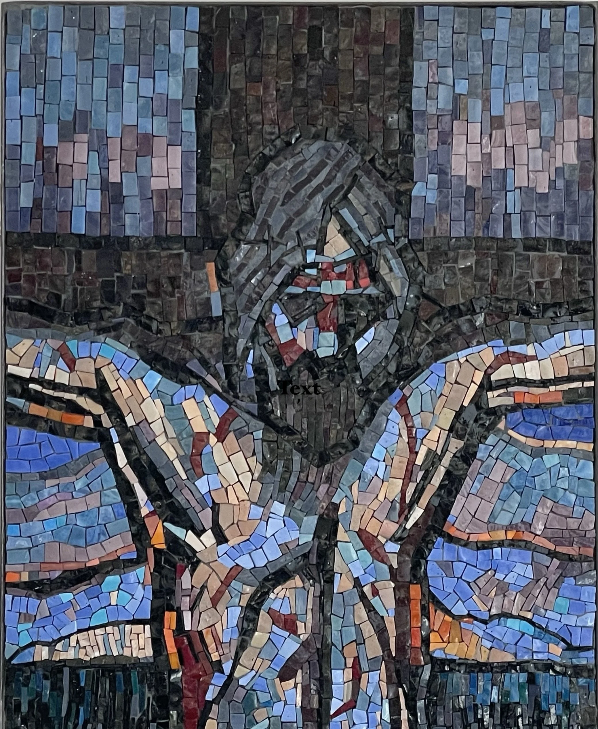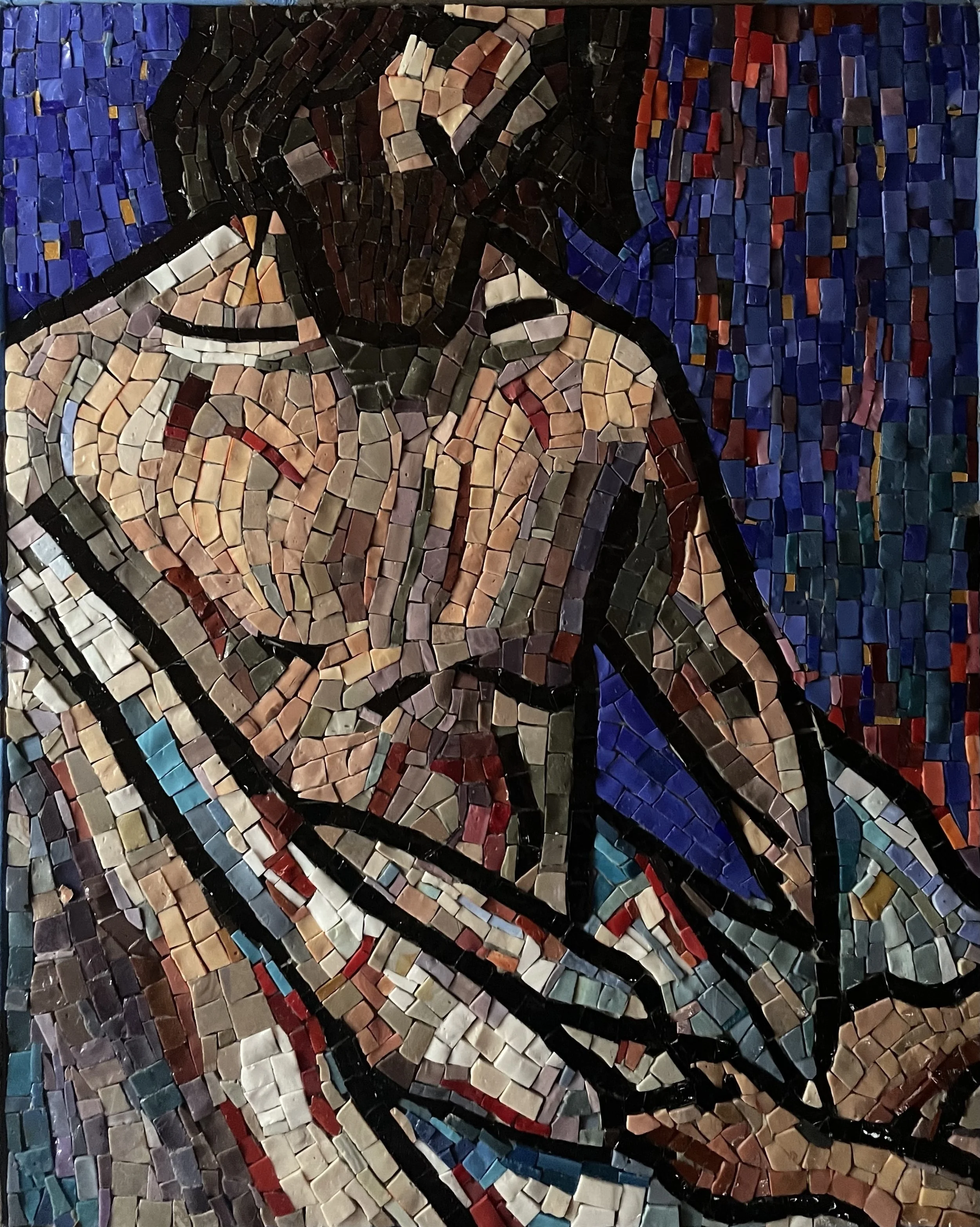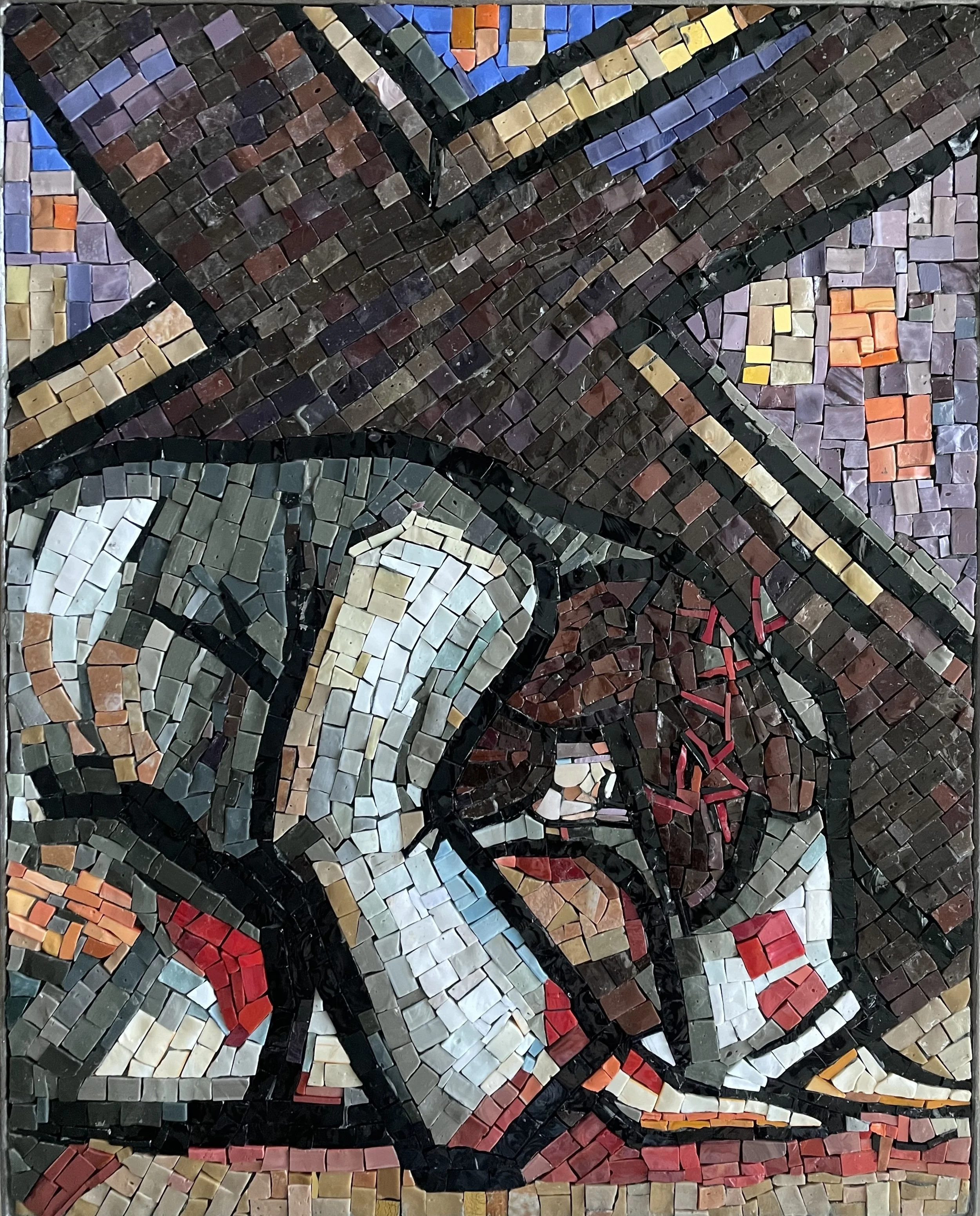 Fabrication process for Station One: Jesus is Condemned to Death. According to the Gospel of Matthew, Pilate washed his hands in front of the crowd before announcing, “I am innocent of this man's blood; see to it yourselves.” The cartoon is under a clear sheet of heavy plastic, covered with fiberglass mesh. Italian glass smalti is adhered directly to the mesh with Laticrete 254 Platinum thinset. The mosaics don’t need grouting. When the mosaic is complete, the plastic is removed and the mosaic is thinset into the metal frame, again using thinset.