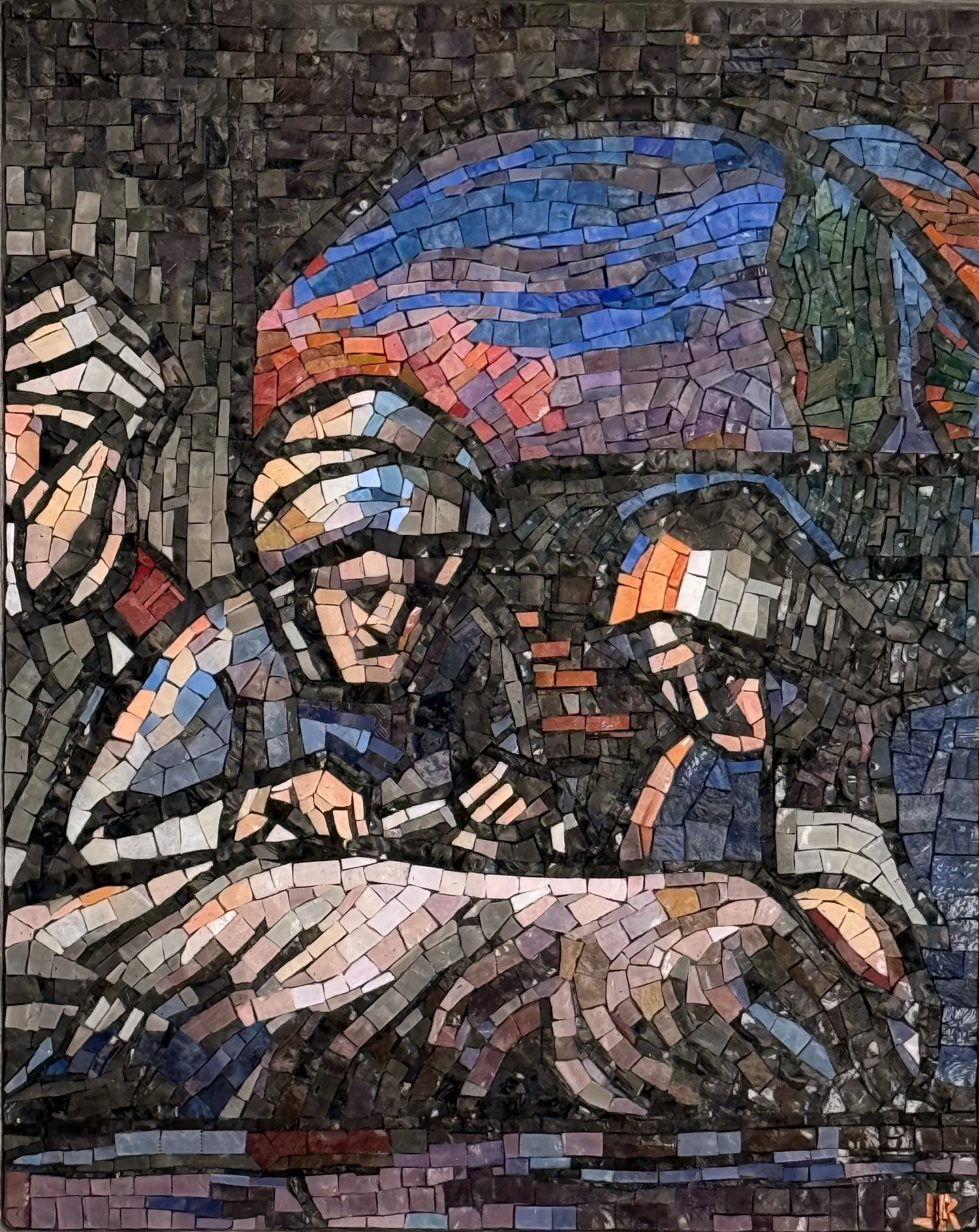 Station One, framed. The clients requested a ruddy texture using mixed materials. I’ve incorporated sheared marble, 24k gold (in Pilate’s robe and the bowl), and transparent smalti in the water.